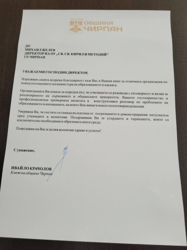 Щастливи сме да споделим с вас едно специално признание. Кметът на Община Чирпан, г-н Ивайло Крачолов, изрази своята благодарност към нашия директор г-н Михаил Желев и целия екип на ОУ „Св. св. Кирил и Методий“ за високото ниво на професионализъм при посрещането на Министъра на образованието.